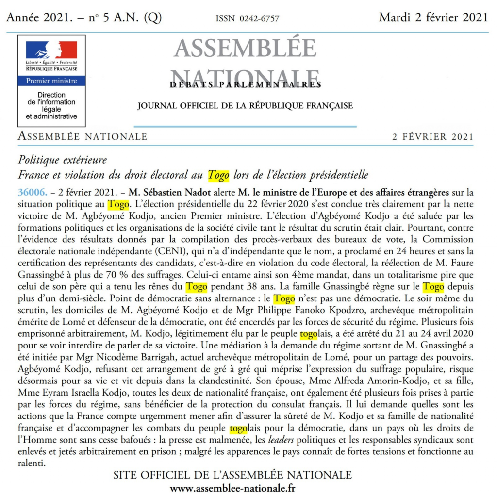 36006. − 2 février 2021. − M. Sébastien Nadot alerte M. le ministre de l’Europe et des affaires étrangères sur la situation politique au Togo. L’élection présidentielle du 22 février 2020 s’est conclue très clairement par la nette victoire de M. Agbéyomé Kodjo, ancien Premier ministre. L’élection d’Agbéyomé Kodjo a été saluée par les formations politiques et les organisations de la société civile tant le résultat du scrutin était clair. Pourtant, contre l’évidence des résultats donnés par la compilation des procès-verbaux des bureaux de vote, la Commission électorale nationale indépendante (CENI), qui n’a d’indépendante que le nom, a proclamé en 24 heures et sans la certification des représentants des candidats, c’est-à-dire en violation du code électoral, la réélection de M. Faure Gnassingbé à plus de 70 % des suffrages. Celui-ci entame ainsi son 4ème mandat, dans un totalitarisme pire que celui de son père qui a tenu les rênes du Togo pendant 38 ans.