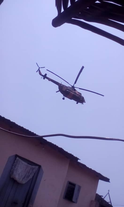 La présence d’un hélicoptère sillonnant la ville et opérant un contrôle, sécurise la zone arienne. Des drones sillonant le ciel viennent en appui à l’ opération. Les militaires fouillent les maisons selon un major habitant la zone.