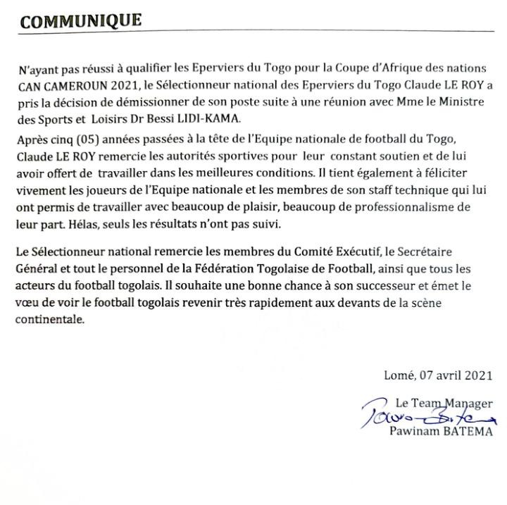 Après cinq (05) années à la tête des Éperviers, Claude Leroy remercie l’équipe sportif et les joueurs et leur souhaite une bonne chance.
